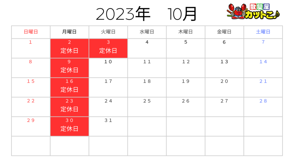 10月の営業日のご案内
